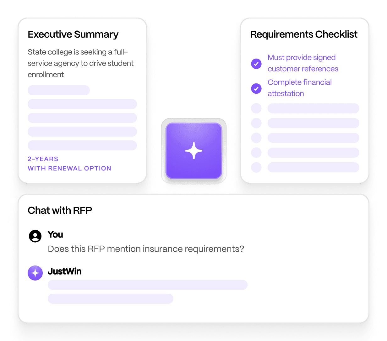 JustWin writes personalized Executive Summaries, scores RFPs for winnability and creates detailed requirements checklists.